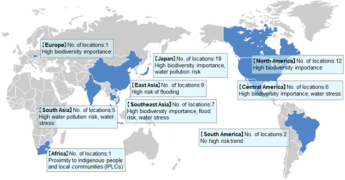In line with five criteria defined by TNFD, we assessed 62 manufacturing locations, including the company headquarters and domestic and international Group companies.