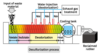 Two screws are turned at high speed, providing the energy needed in devulcanization. By maintaining optimum settings for screw shape, rotation speed, temperature, and other factors, we have developed a method that restores the properties of rubber in a short time.
