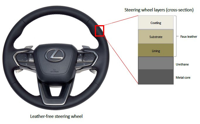 The demand for vegan leather products has been rising in recent years, mainly in North America and Europe, due to concern about animal welfare and environmental problems. At Toyoda Gosei, we are developing a vegan leather steering wheel. Until recently, the use of vegan leather on luxury vehicles was considered difficult in terms of feel, appearance and durability, but in 2022 we developed a vegan leather steering wheel that has a luxurious feel. This steering wheel was used in the leather-free package of the Lexus RX sold by Toyota Motor Corporation. We will continue developing vegan leather products to respond to customer needs in the coming years.
