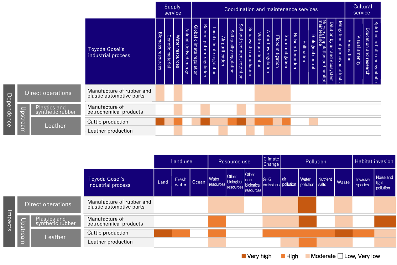 Based on the LEAP approach*8 recommended by the TNFD, Toyoda Gosei assessed the nature-related dependence and impacts in the automotive parts business, and the points of contact with nature in regions where business activities are conducted. We utilized external tools such as the UNEP FI*9 Encore and the IUCN*10 IBAT for scientific and objective assessments.