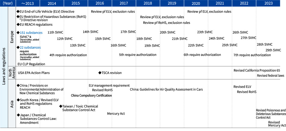 To strengthen the management of chemical substances in our products, we control substances that are legally regulated in each country, substances that are self-regulated by automakers, and substances covered by our own company regulations. We monitor the trends in European REACH*1 regulations and the EU RoHS Directive*2 and have a system in place to respond rapidly when these regulations are revised.