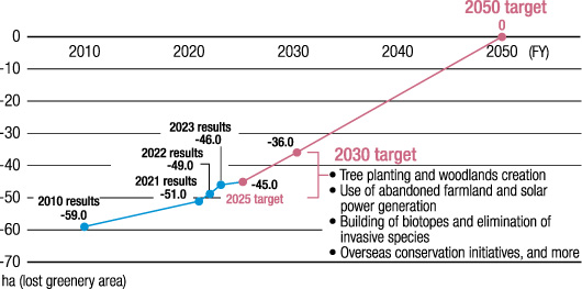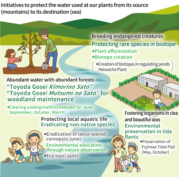 We have set a “No Net Loss of Greenery” goal of restoring 59 hectares of greenery by 2050, which is equivalent to the area of our plants, and are conducting initiatives to achieve this goal. Specifically, under the slogan “Connecting Activities with Water, the Source of Life,” we are conducting initiatives in the areas of mountains, rivers, and oceans. Among these efforts, the biotope* maintained on the Company premises has been recognized as a biodiversity conservation area, designated as a “Nature Coexistence Site” by the Ministry of the Environment.