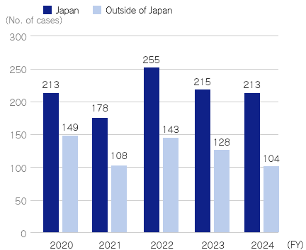 As a result of activities to continuously acquire intellectual property rights based on long-term perspectives, 213 patents were registered in Japan and 104 in other countries in FY2024. These intellectual property rights are effectively utilized as intellectual capital, which is a necessary input in business activities.