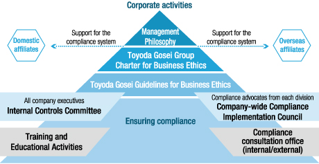 Toyoda Gosei has established the Internal Controls Committee with the Company’s president serving as chairman and all company officers as members, whose activities include reporting on and discussing the status of compliance with business ethics, laws, and regulations. The items reported and discussed in the Committee are shared with the compliance advocates selected by each department in the Company-wide Compliance Implementation Council so that they will be incorporated into the activities of each workplace. The Committee works for thorough compliance with a unified approach between management and the workplace.