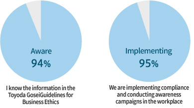 In the FY2023 survey, awareness of the Toyoda Gosei Guidelines for Business Ethics was 94%, and the implementation of activities to promote compliance and make the Guidelines known to people was 95% (see figures above).