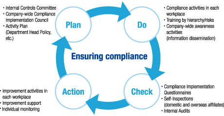 Domestic and overseas Group companies conduct annual self-inspections of the status of their compliance implementation systems, status of compliance with antitrust and competition laws, other important laws and regulations, and on the absence of corrupt practices including bribery, as well as risks in key functions including internal controls, human resources, accounting, procurement, and quality. Based on these results, our functional departments guide each company in rule-setting and training, continuously reinforcing compliance across the Toyoda Gosei Group by implementing the PDCA cycle.