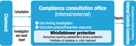 We have established compliance consultation offices both inside and outside the company for the purpose of early detection and correction of compliance issues and violations of internal rules and laws and regulations in the course of business operations. Outside lawyers are in charge of the external offices to deal with problems from an objective standpoint. This system allows all employees of the company and family members living with them to receive consultations, and the company takes thorough measures to protect their privacy and ensure that they will not be treated unfairly because of their report. In addition to the internal consultation office of each Group company in Japan, they also have a common external compliance consultation office with the Company. Overseas Group companies also have external or internal consultation services. In FY2023, as a result of making the consultation offices known to all and building trust, 84 reports and consultations were received from within the company and its domestic affiliates, mainly concerning labor management, workplace problems, and harassment.