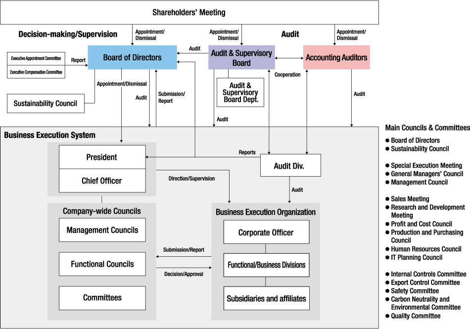 Toyoda Gosei has chosen an audit and supervisory board company and set up the Shareholders’ Meeting, Board of Directors, Audit & Supervisory Board, and accounting auditors as statutory entities. We have also put in place internal auditors and other internal control systems including internal audits. The Board of Directors consists of ten directors and holds regular monthly meetings (extraordinary meetings held as needed), where matters prescribed by law or in the Articles of Incorporation and important matters such as strategies related to corporate management are reported and resolved.