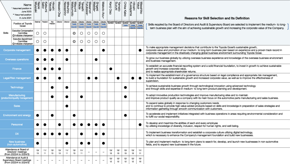 | Outside directors | Mayumi Matsumoto | ○ | To benefit from her management oversight and advice based on her extensive experience and high-level insight as a news anchor and researcher in the broad fields of social issues, environment, and energy in the management of Toyoda Gosei. Ms. Matsumoto has been designated as an independent auditor because she meets the requisite criteria and is deemed free of potential conflicts of interest with regular shareholders. |