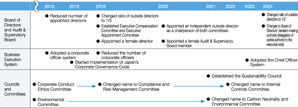 A system of corporate officers is used to speed up decision-making and business execution. Furthermore, by introducing the Chief Officer System in June 2023 and transferring some of the president’s authority and responsibilities to the Chief Officers, we will cross over the boundaries of business and regional operation bases to manage priority functions on a global basis, thereby realizing highly strategic business execution and accelerating the speed of management. Additionally, in June 2024, we delegated part of the Board of Directors’ decision-making authority to the executive side. Through this, we aim to enrich the discussion of management strategies in the Board of Directors, establish new Special Execution Meetings on important matters, and enhance execution speed and autonomous management.