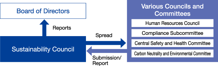 In this Council, in order to accelerate our sustainability initiatives, we have established the structure shown on the right to deliberate and decide on priority issues and confirm the status of implementation.
