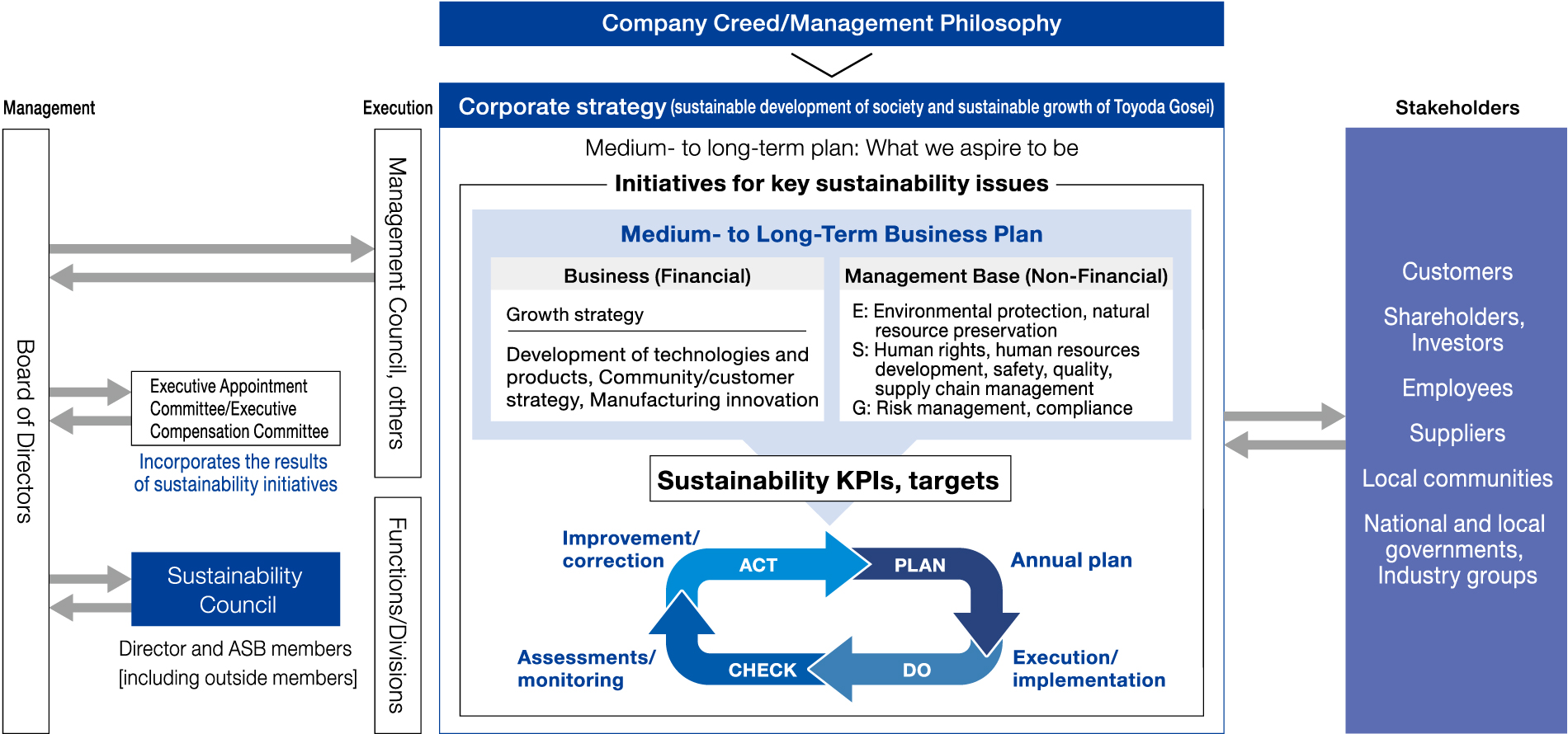 We have built a management system to further efforts for the sustainable development of society and sustainable growth of Toyoda Gosei through business activities based on our company creed and management philosophy. Emphasis is placed on repeated dialogue with all of our stakeholders, establishment of KPIs and targets to achieve our medium-term business plan, and performing the PDCA cycle.