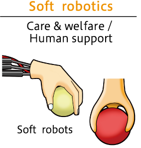 With e-Rubber sensors on their fingers, these robot hands possess a “sense of touch” and can perform work in a more human-like way with the ability to sense the shape and softness of objects, an ability that conventional robots have lacked. Highly accurate e-Rubber sensors enable just one hand to handle various objects, whether they are heavy, light (less than 100 grams), or soft.