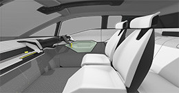 This concept is compact battery EVs around the year 2030 and shows the company’s vision for how Toyoda Gosei technology contributes to vehicle safety and comfort. The exterior features technology for autonomous driving such as a sensing function that detects the vehicle surroundings and a notification function that communicates with pedestrians and others through light and sound. The interior is equipped with technology to create a spacious cockpit. Operating functions such as the accelerator and brakes are consolidated on a long telescoping steering wheel, which can be retracted into the instrument panel during autonomous driving. Lap airbags are integrated into the seatbelts. This makes it possible for the vehicle to accommodate diverse riding postures, while also contributing to thinner instrument panels.