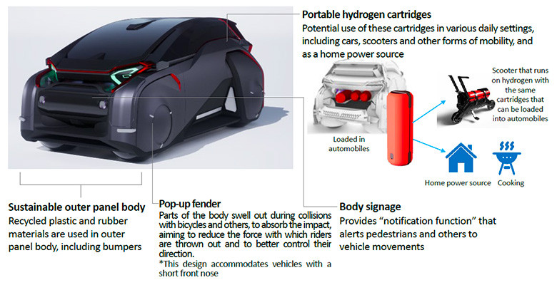 This is a fuel cell vehicle (concept model) that runs on hydrogen and incorporates Toyoda Gosei’s future technology. It proposes a future where mobility and daily living are seamlessly linked with the use of hydrogen energy. In addition to new technologies that increase safety of pedestrians and cyclists, recycled materials are used in the body.
